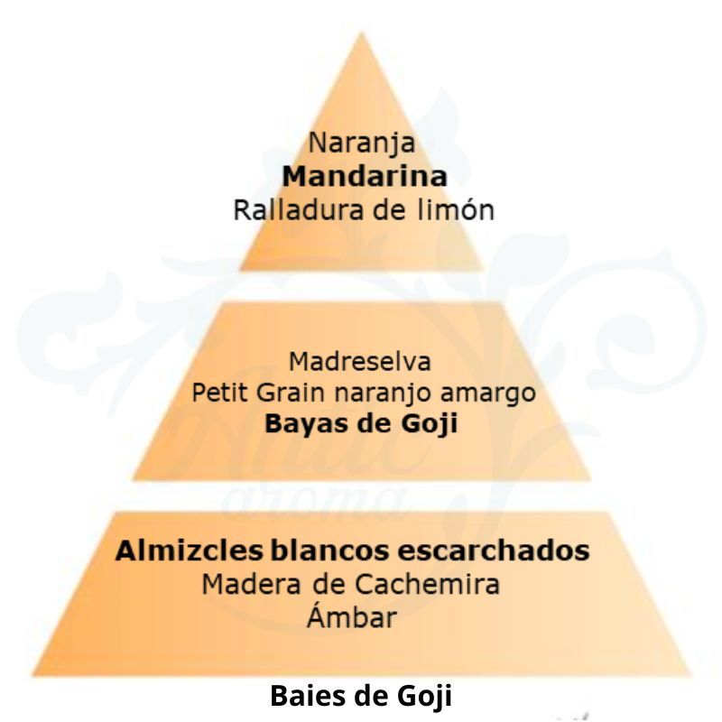 El aroma Baies de Goji es una fragancia frutal que combina la dulzura exótica de las bayas de goji con la frescura cítrica de la naranja y la mandarina. Este delicado bouquet se enriquece con las notas florales de la madreselva y el toque cálido de la madera de cachemira, creando un ambiente acogedor y sofisticado.